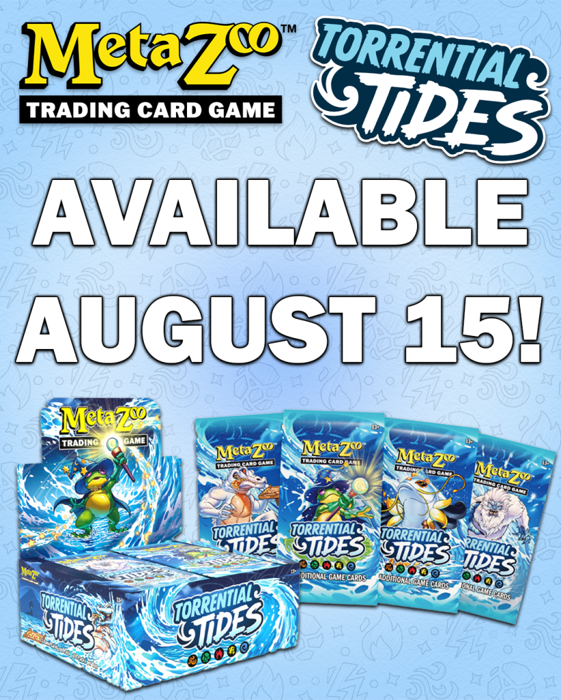 Discover what lurks just beneath the surface! As tides rage across the MetaZoo trading card game, Water Aura creatures debut next to the other four types to flood the field! From the Loch Ness Monster and the terrifying Sewer Alligator to the Yeti, the unexpected Colossal Koi, and the elusive Loveland Frogman, MetaZoo TCG: Torrential Tides brings the next wave of cryptids and Casters to the game.